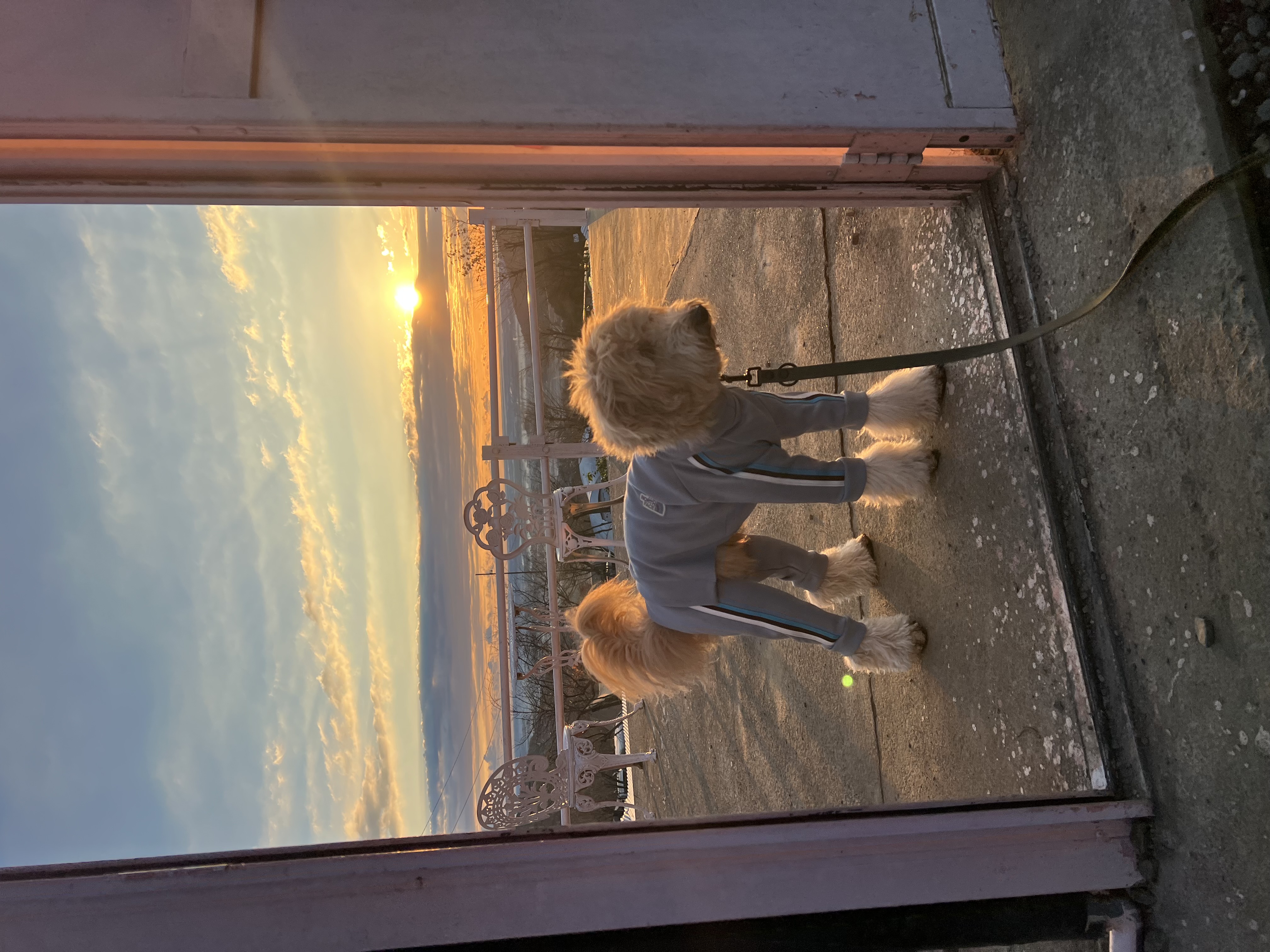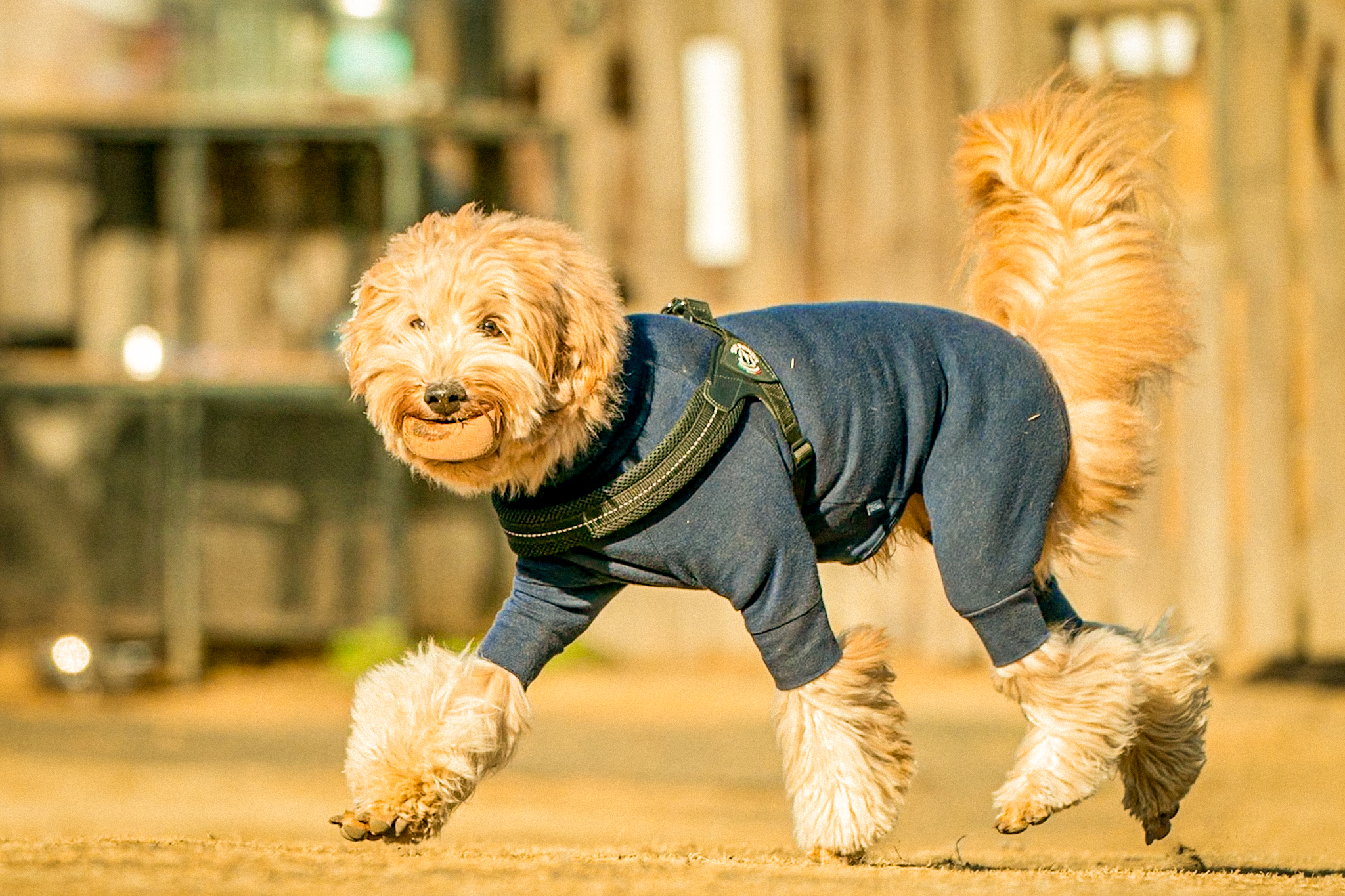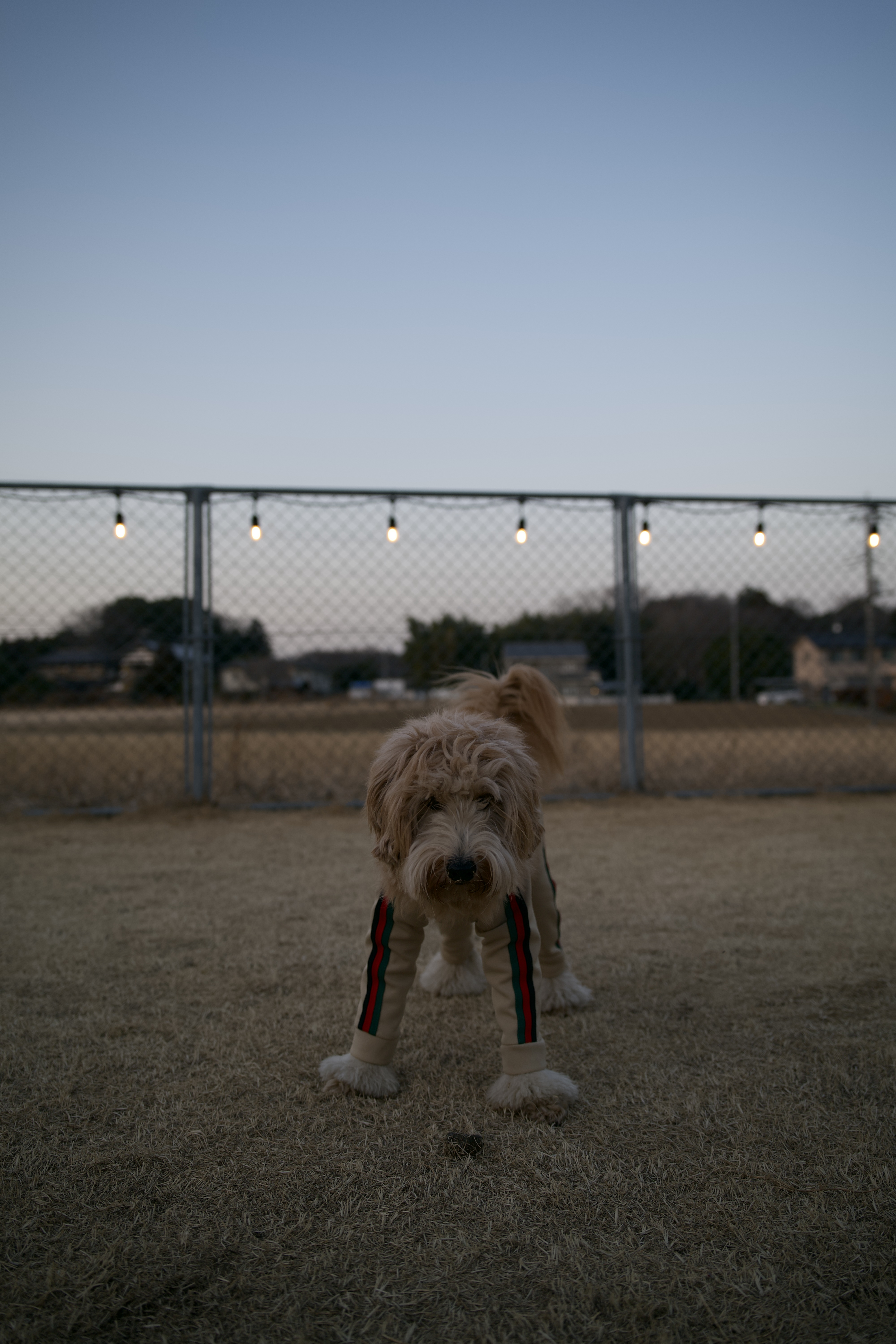 !夕暮れの屋外で佇む犬の姿 画像には、クリーム色または薄茶色の毛並みを持つ犬が写っている。犬種はラブラドゥードルやゴールデンドゥードルのように見える。犬はベージュ系の全身服を着用しており、側面に赤と緑のストライプ模様があしらわれている点が特徴的である。足元は白いフワフワした素材で覆われている。 犬は低い姿勢でカメラの方向を見据えており、その表情からはどこか好奇心のようなものが感じられる。 背景には、乾燥した茶色い芝生のような地面が広がる。その後方には金網フェンスが設置されており、フェンス上部には複数の電球が等間隔に吊るされ、点灯しているのが確認できる。フェンスの奥には、木々や建物らしき影が見え、郊外のような場所と推測される。空は薄い青色であり、撮影は夕暮れ時、または夜明け前の時間帯に行われたものと思われる。 全体として、広々とした屋外空間で、個性的な服装の犬が佇む瞬間が捉えられている。 Generated by Gemini