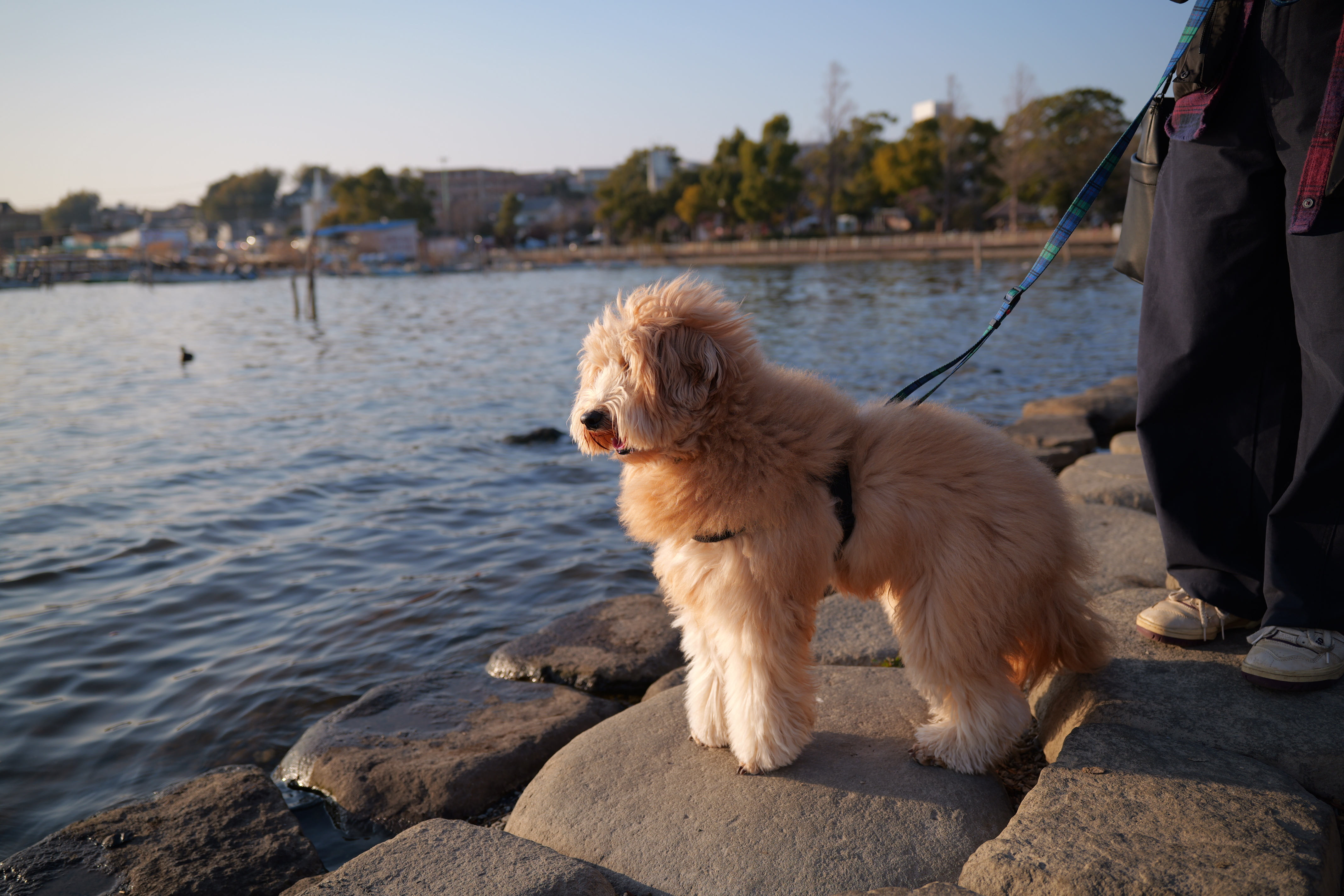!水辺に佇む毛並みの良い犬 画像には、毛並みの良い茶色の犬が水辺の岩の上に立っている様子が捉えられています。犬はハーネスを装着しており、リードが繋がっています。画面右端には、犬を連れている人物の足元(濃色のズボンとスニーカー)が見えています。 犬は前方、水面に向かって視線を向けており、口元はわずかに開いているように見えます。背景には広がる水面があり、穏やかな波紋が確認できます。水面の向こう側には、建物や木々が連なる街並みが広がっており、湖畔か大きな川のほとりのような場所と推測されます。 全体的に夕暮れ時か朝方のような、暖かく低い角度からの光が当たっており、犬の毛並みや岩肌が金色に照らされています。 Generated by Gemini